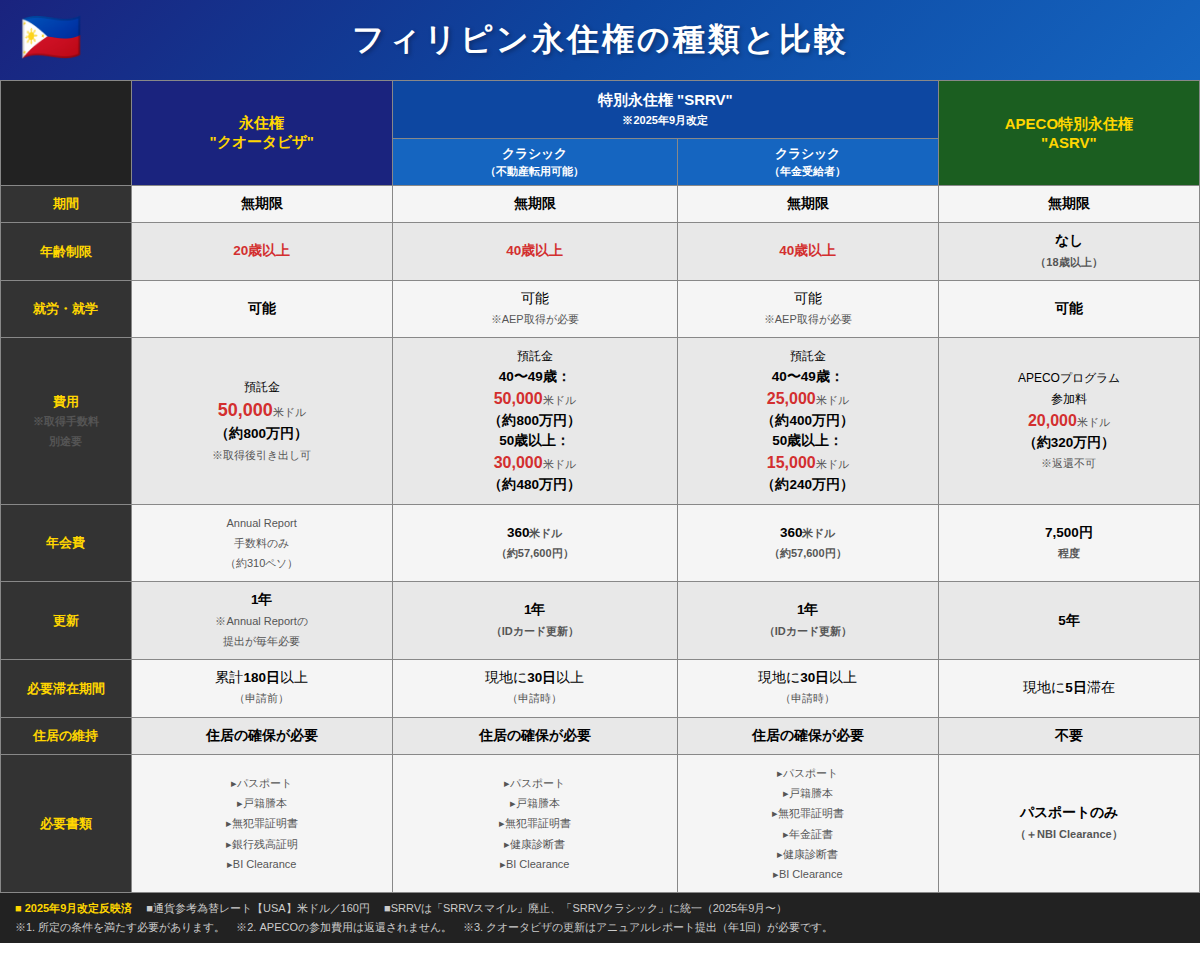 そこで、こちらの記事ではフィリピンで日本人が取得できるビザのうち、フィリピンへの移住を考えている方に最適なビザである、「永住権」と「退職者ビザ」をご紹介します。永住権にも種類があり、代表するものとして「ASRV(アペコ特別永住権)」、「クオータビザ」、「SRRV(退職者ビザ)」があげられます。