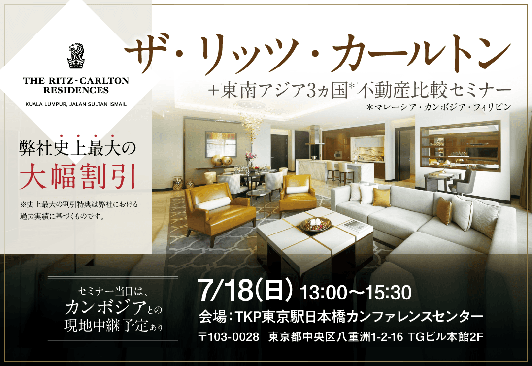 世界中に展開する有名5つ星ホテルグループであるザ・リッツ・カールトンレジデンスが弊社史上最大の大幅割引!ザ・リッツ・カールトンは世界で32個、東南アジアには3個のみと限定的な供給となることから、長期的な資産性は高く維持できるものと考えられています。